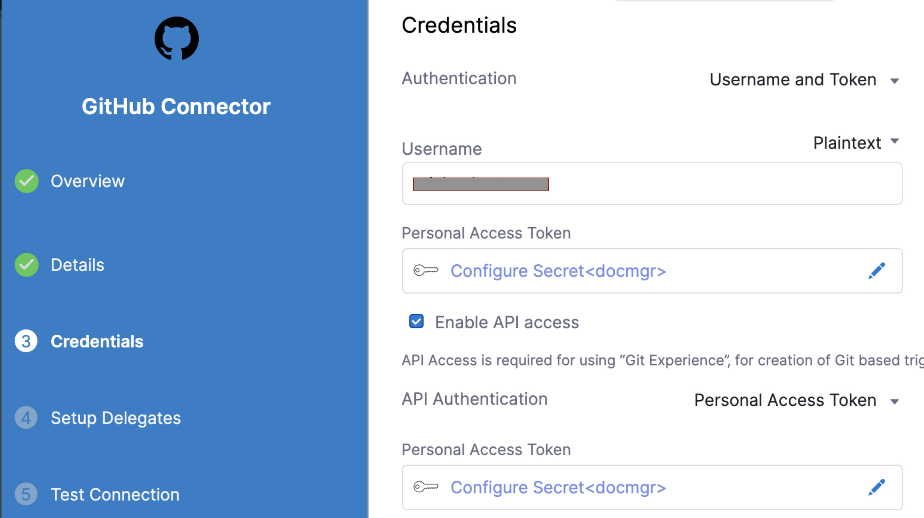 The Connector must use the Enable API access option and Username and Token authentication. Harness requires the token for API access. Generate the token in your account on the Git provider and add it to Harness as a Secret. Next, use the token in the credentials for the Git Connector.
