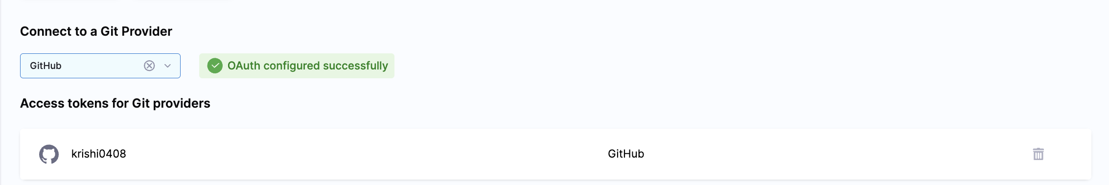Once done you will see Oauth Configured successfully in the profile page along with your Github account username under Access token for Git Providers