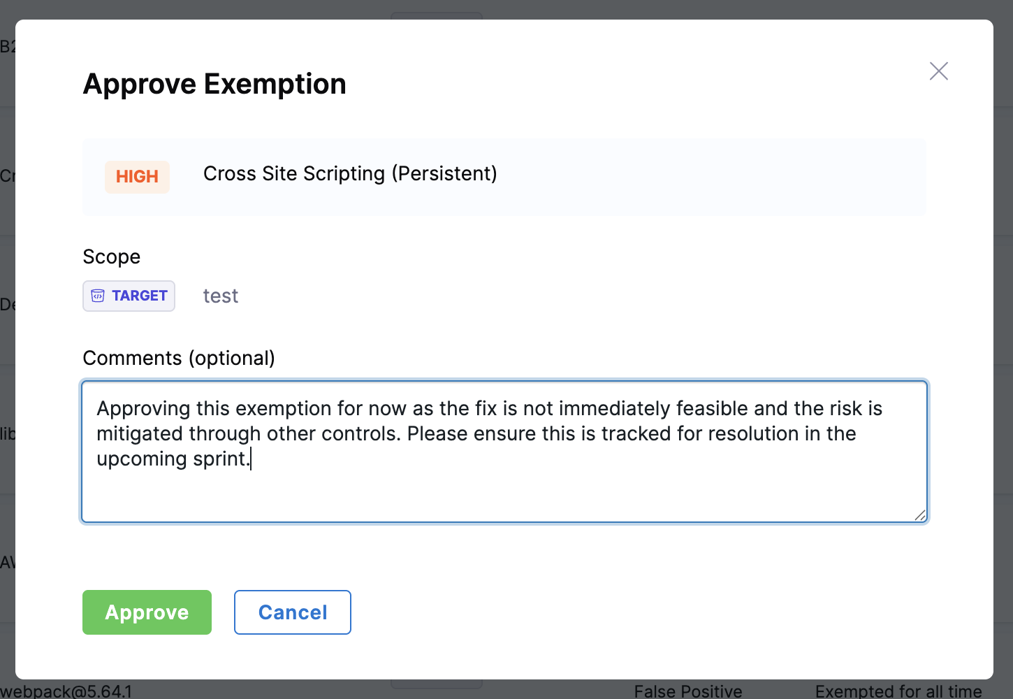 - Approve for this target – Applies the exemption only to the specific target where the issue was found.